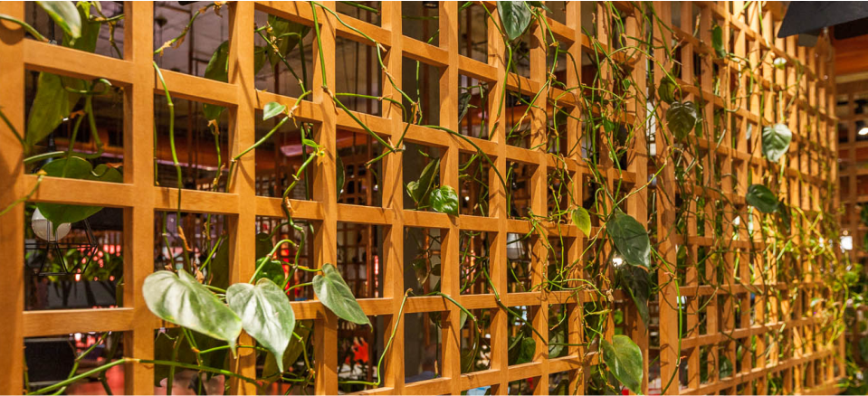В результате офис сделали Open space формата. Свободное пространства без скованности и ассоциаций с бетонной коробкой – было главной задачей дизайн проекта офиса Synesis. Именно поэтому пространство разделили на просторные зоны, разделенные между собой деревянными решетками, обвитыми лианами. Кстати, вся зелень в офисе живая. В среднем, на каждом из этажей около 50 растений, и ухаживают за ними флористы, регулярно приходящие в офис, в том числе и по ночам. Со светом для роста проблем нет: над каждым цветком установлены специальные лампы. С теми же мотивами на каждом этаже дополнительно зонирует пространство решетка с тысячей кованых листочков лианы.