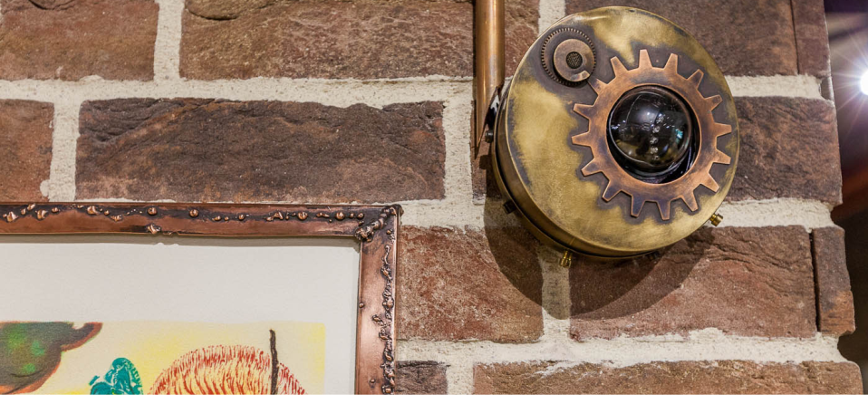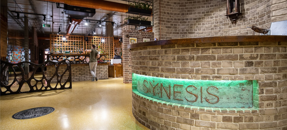 Интерьерная основа Synesis — идеи Антонио Гауди, пропущенные через любовь к стимпанку. Самый заметный референс — оформление окон и некоторых перегородок, а также витражи вместо отдельных окон, выполненные белорусским художником Алексеем Лосиком. Кованые ограды ручной работы, литографии Дали с его личной подписью, стимпанк-рамки телевизоров и видеокамер.