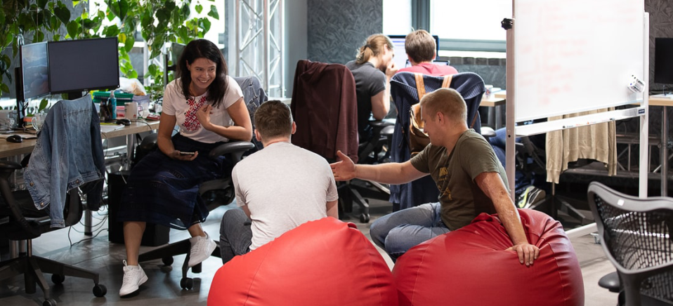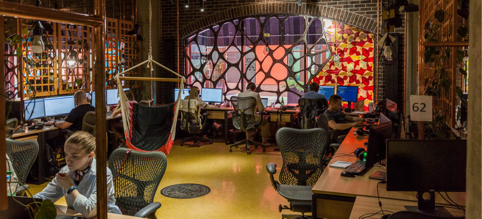 Офисное пространство выполнено в стиле лофт. Перегородки делят помещение на полузакрытые «кубики», в каждом из них рабочие столы стоят по периметру, чтобы сохранить максимум пространства. В каждой секции висит гамак либо стоит пуф, так что отдохнуть можно в любой момент. Команды могут менять локацию и общаться друг с другом с большей эффективностью.