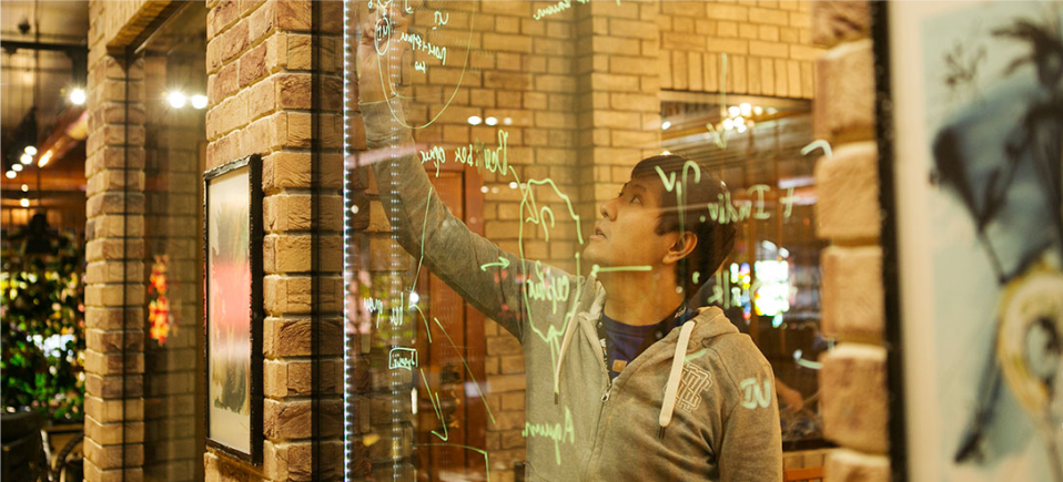 В стеклянные стены переговорных комнат встроена подсветка, на них пишут неоновыми маркерами. Выглядит современно и экономит пространство. На каждом этаже есть переговорка, стены которой обложены высушенными брусьями, сделанными из деревьев Беловежской пущи. Около полугода ушло на их обработку и сушку. Вышло патриотично и смотрится здорово, а запах - потрясающий.