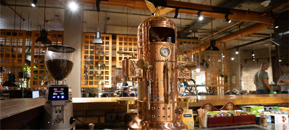 Смысловой центр кухни третьего этажа — кастомная кофемашина: таких в мире всего несколько. Одна, например, находится в Музее кофе в Дубае. В Synesis сделать напиток в ней может каждый.