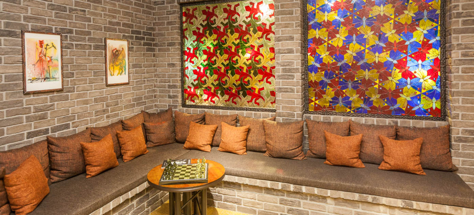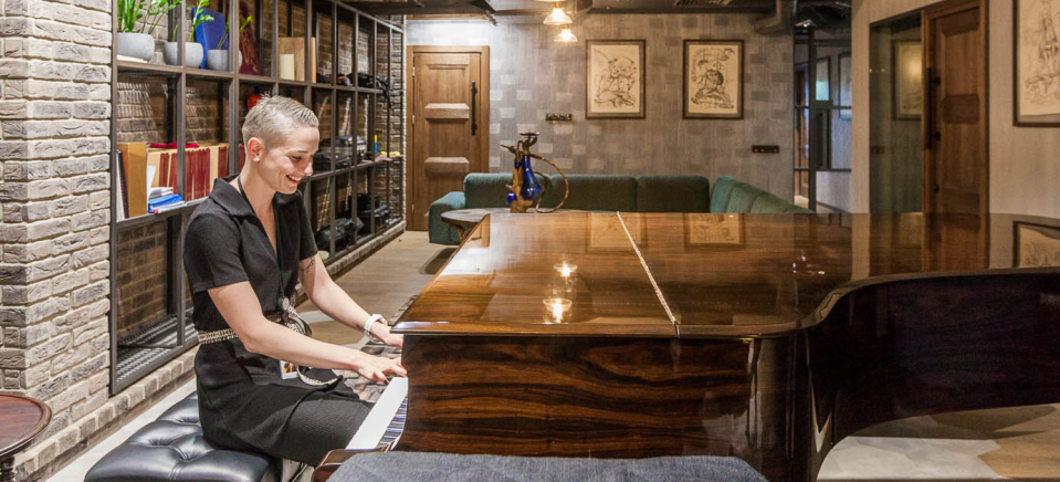 Как и везде, чувствуется желание сделать все вокруг максимально аутентичным: просторный холл содержит кастомный виниловый проигрыватель, с отличной коллекцией пластинок в довесок, отъезжающую дверь и «тюремные» решетчатые перегородки, удобные «мягкие» зоны, невероятно большой аквариум, электропианино и великолепный рояль, на котором часто играл знаменитый композитор Юрий Блинов.